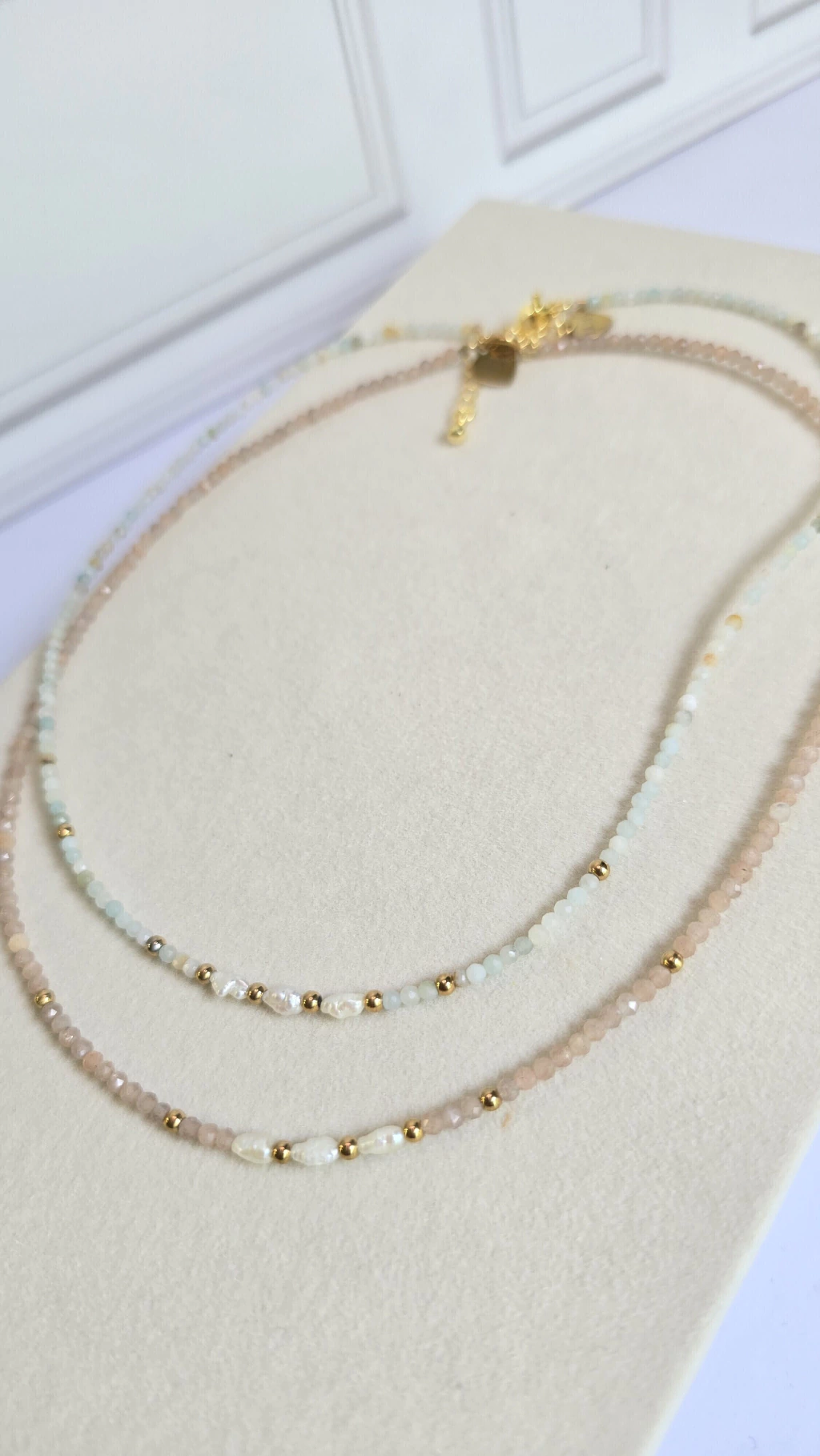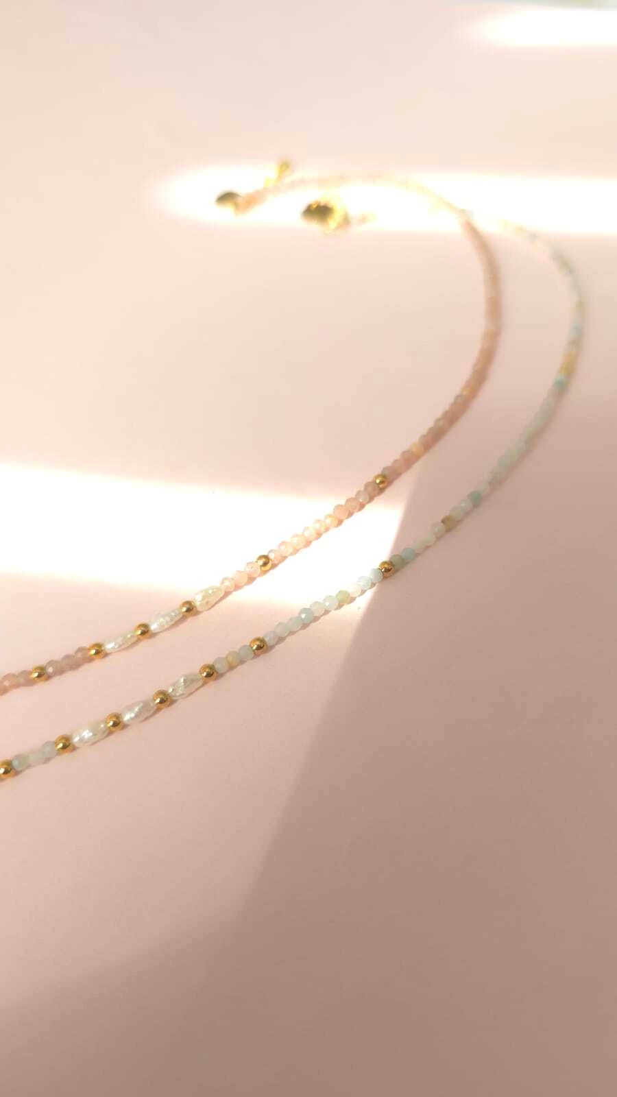 Collar hecho a mano con piedra natural de 2 mm, fornituras de acero 316L y detalle en piedras de rio naturales